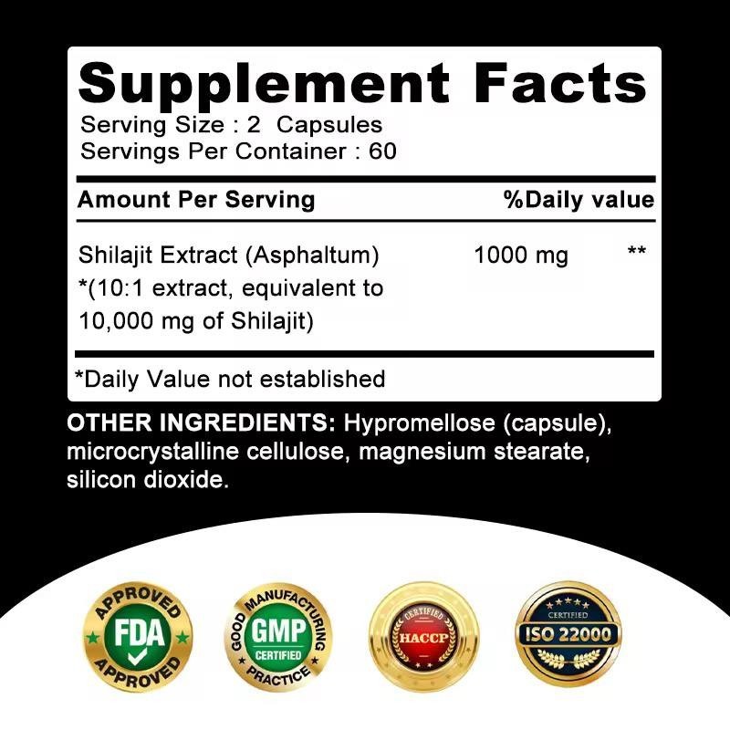 Specifications of Pure Himalayan Shilajit 10,000 mg Maximum Potency Organic Capsules with Fulvic Acid and Trace Minerals for Energy and Immune Support in Men and Women